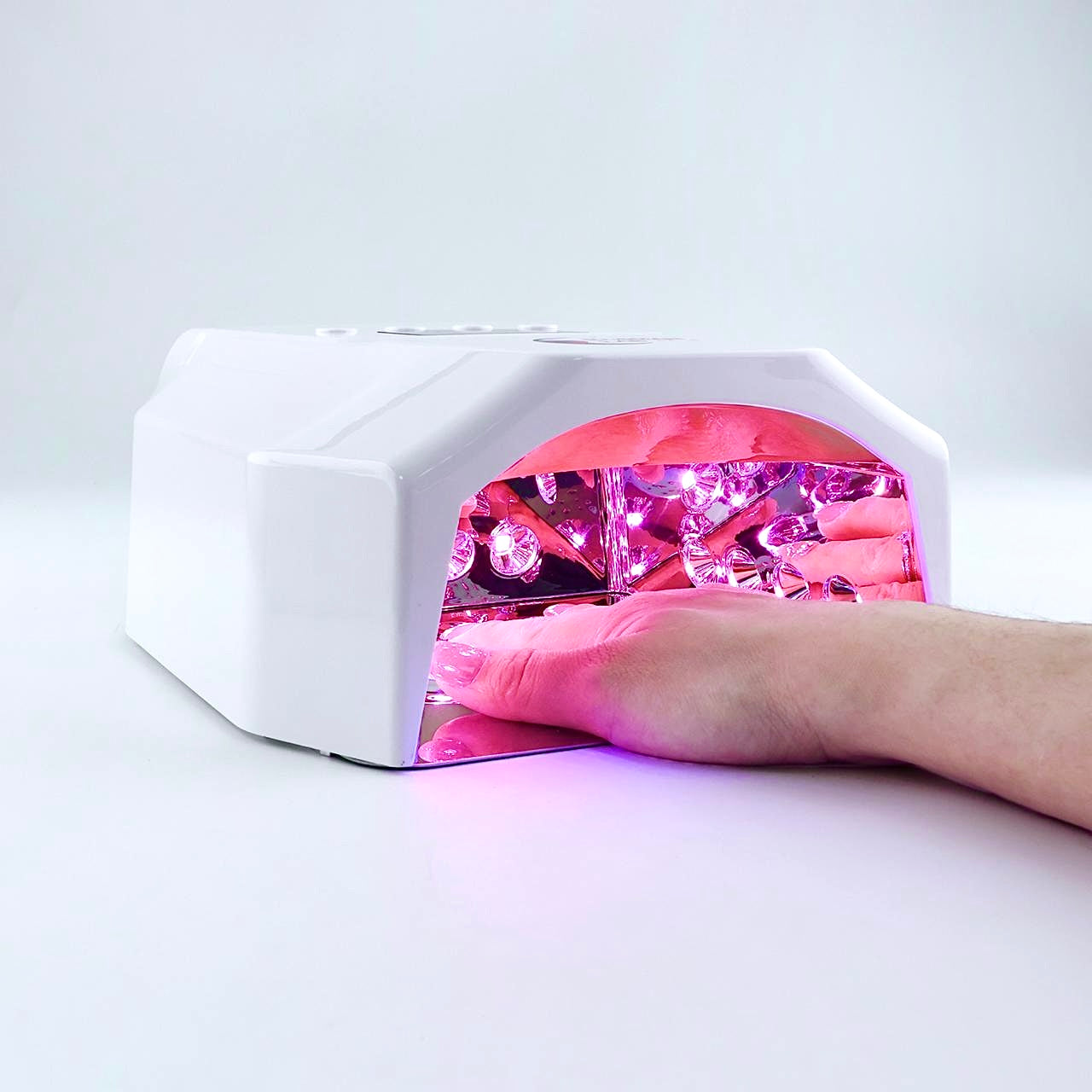 L’interno della lampada è completamente rivestito a specchio (base, parte superiore e laterali), garantendo una riflessione totale della luce. Questo sistema elimina qualsiasi zona d’ombra e assicura una polimerizzazione uniforme e completa su tutte le dita, inclusi pollice e aree critiche.